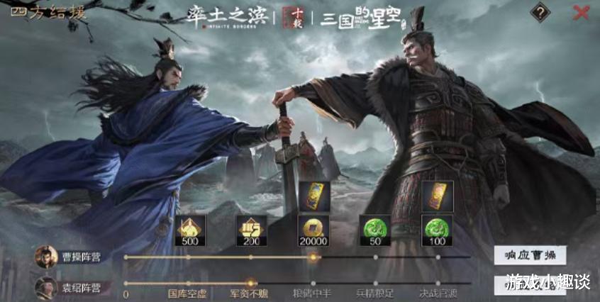 玩家还可在联动主题服中得到多位武将的助阵。在响应袁绍或曹操中任一阵营的求援并满足指定目标后,本阵营的玩家将获得资源和虎符等道具作为奖励。援助数量达到一定程度后还将开启武将奖励,每一档都可以任选一个赛季武将,大幅降低开荒期时面临的压力。