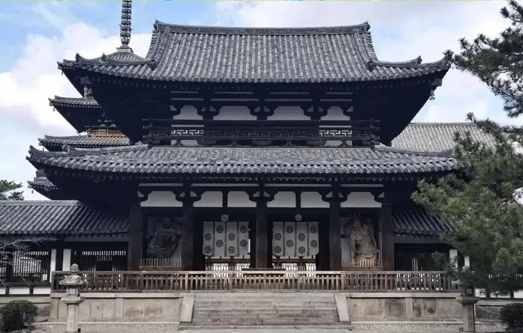 日本木质建筑的结构、制式受中国影响较深。飞鸟、奈良时期日本的木建筑艺术融合隋唐文化精髓达到了顶峰,为后世遗留下了大量国宝级建筑。比如,法隆寺、法起寺等著名的寺庙建筑就多为悬山或歇山顶,屋顶覆盖瓦片,布局沿中轴对称,极具东方韵味。