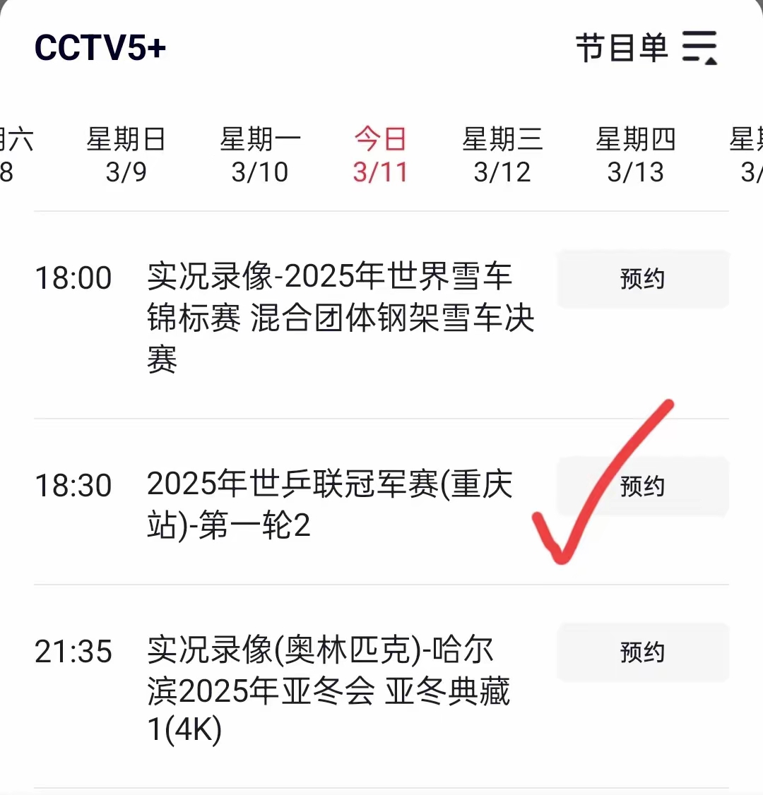 CCTV5:10:35开始直播,涵盖蒯曼、林诗栋、孙颖莎等比赛;CCTV5+:18:30接力直播,聚焦林高远、张本智和等晚间赛事。