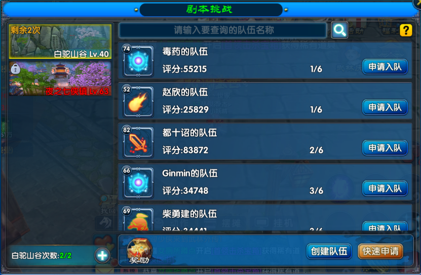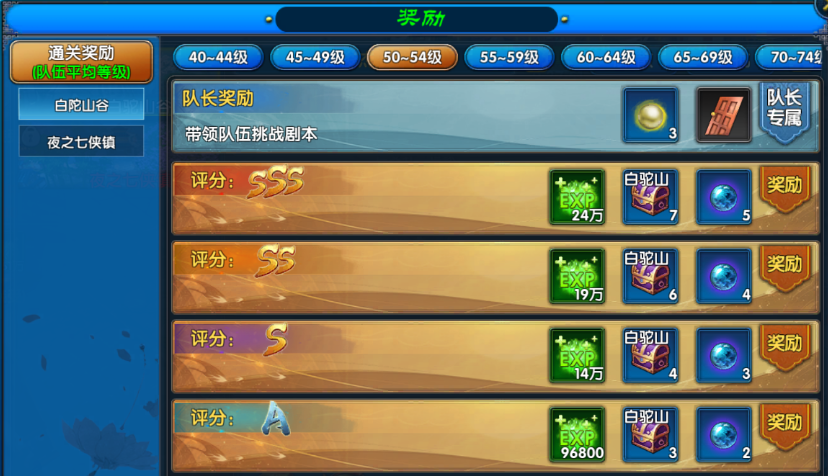江湖冒险从不含孤身前行!40级起,每5级划分一个挑战区间,召集5位志同道合的侠客组队,确保队伍平均等级匹配区间,即可解锁白陀山谷副本。