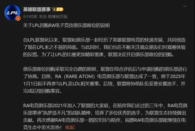以下是官宣内容:为了让LPL的比赛更加精彩紧凑,联盟决定回购俱乐部的席位,本着自愿的原则,目前RA与联盟达成一致,将于明年起不再参加LPL和LDL的赛事,队内选手将由联盟帮助安置。最后LPL官方也感谢RA在LPL三年的贡献和陪伴,祝福他们未来更好。看到这个通告后,RA的官微也跟着转发,祝愿LPL继续蓬勃发展,期待更多的杰出选手和精彩绝伦的比赛。