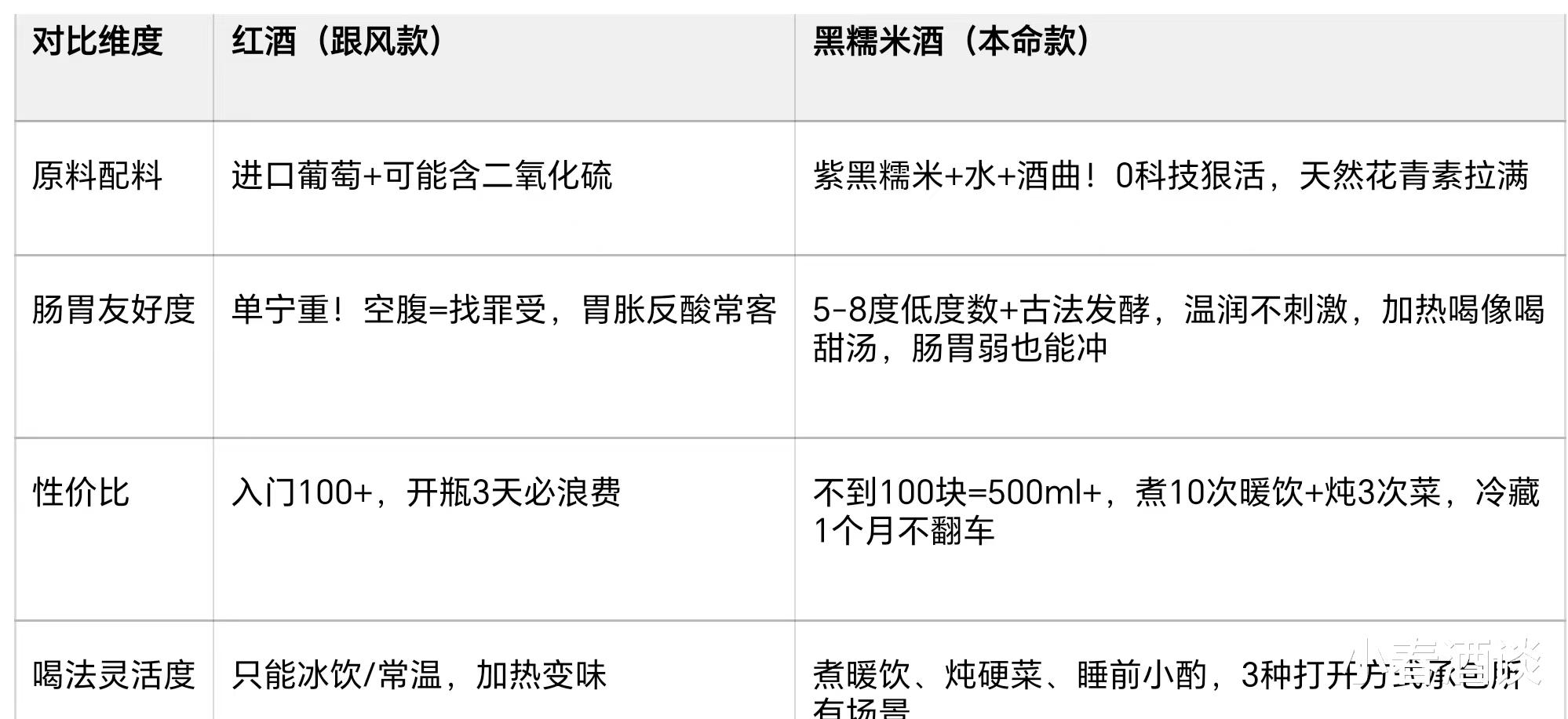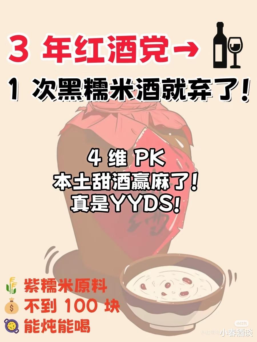 从对比就能看出,红酒更像“精致的外来品”,而黑糯米酒则是“懂你的本土味”。它没有复杂的工艺和高昂的溢价,却精准踩中了中国人的核心需求:健康、温和、实用、高性价比。