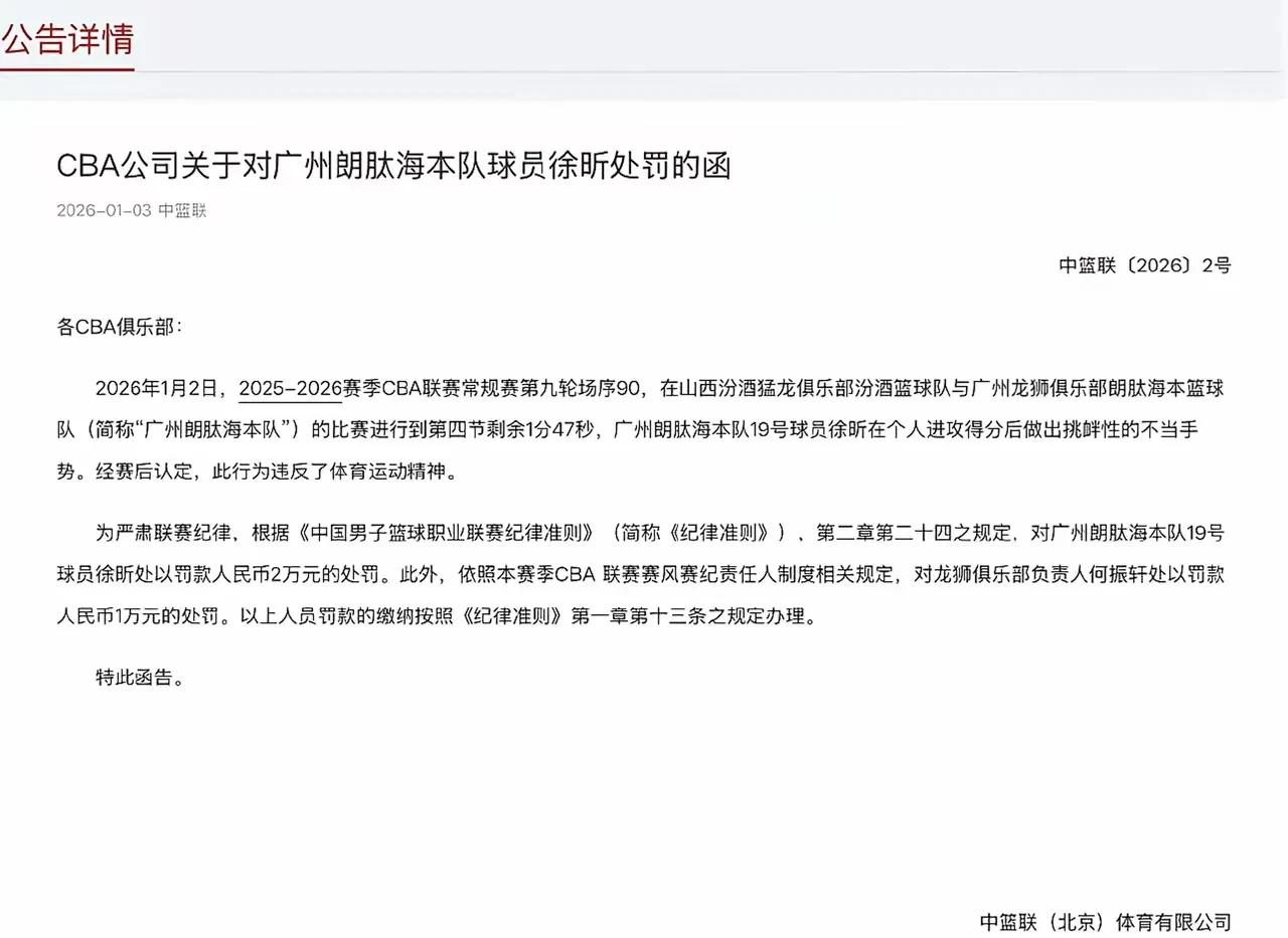徐昕自从离开广东加盟了广州之后,球涨了不少,并且能力也是越来越强了,在广州已经是球队的主力中锋。上一场比赛中徐昕隔扣了刘传兴之后,做出了抹脖子的挑衅动作。昨晚深夜CBA对徐昕的这个动作做出了2万元的处罚,并且连带俱乐部的负责人也要处罚。
