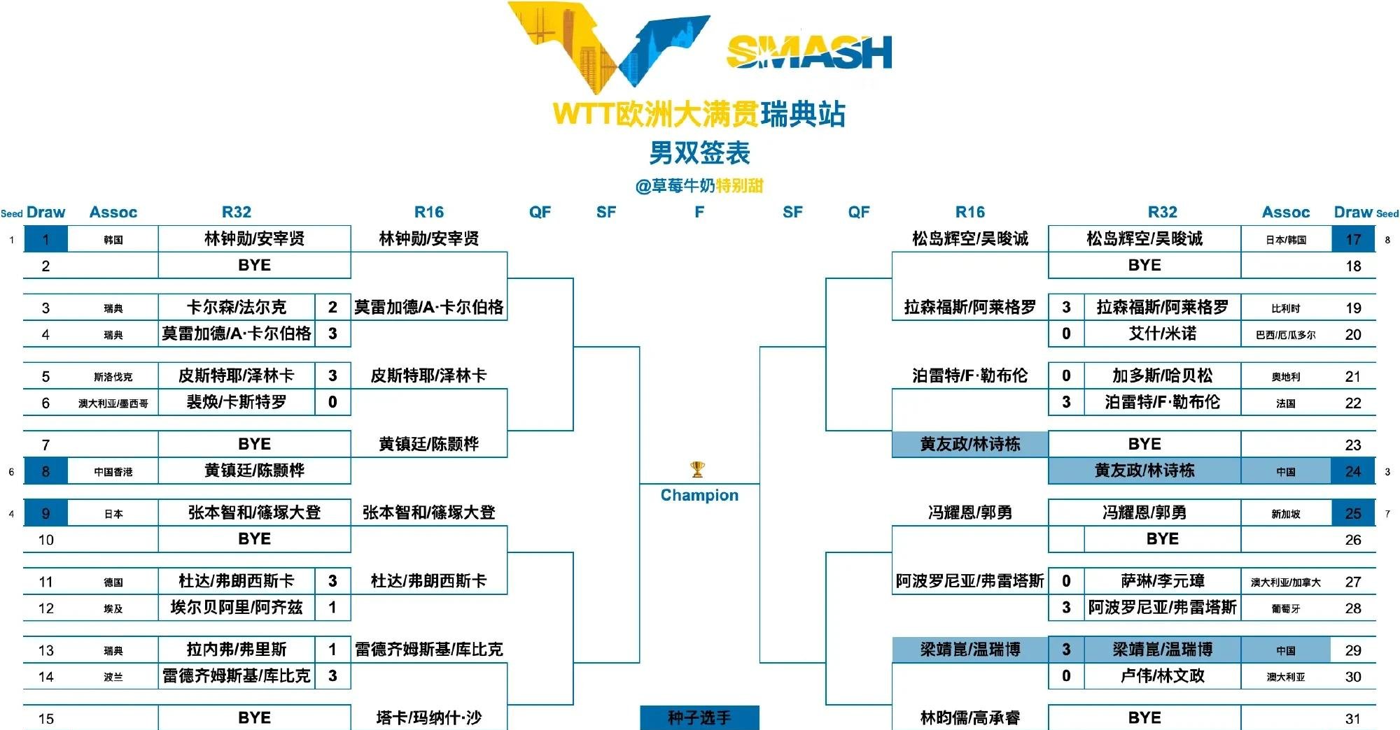 本站比赛国乒派出两对组合参赛,林诗栋/黄友政首轮比赛轮空,直接晋级16强。梁靖崑/温瑞博在昨天结束的首轮比赛,3:0战胜澳大利亚组合林文政/卢伟取得开门红。首次搭档参赛的梁靖崑/温瑞博展现出了不俗的实力。
