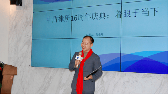 付金峰律师作为“中盾优秀合伙人”代表发表了《法眼之光--律师—着眼于当下》主题演讲。付律师谈到,在庆祝16周年之际,我们不仅要回顾过去的成就,更要关注当前的法律市场动态。我们需要审视自身的定位与发展策略,以应对未来的机遇与挑战,确保律所的持续竞争力。我们要不沉溺于过去、不焦虑于未来、专注当下每一步,通过不断优化和提升当下的工作,为未来打下坚实的基础。