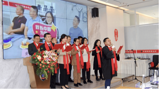 年会在庄严的国歌声中启幕。全体律师肃立齐唱,歌声铿锵。这一刻,家国情怀与职业信仰交融。其后,中盾律所党总支书记张建锋带领各支部书记郭建立、赵威风、郭会丽共同上台开启十六周年庆典启动仪式。这一仪式简约而寓意深远,象征着中盾在党建引领下,组织根基牢固,发展步伐稳健。