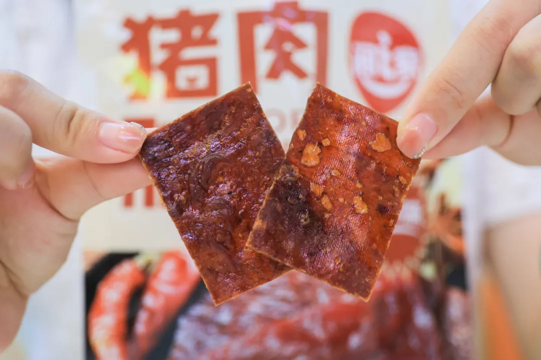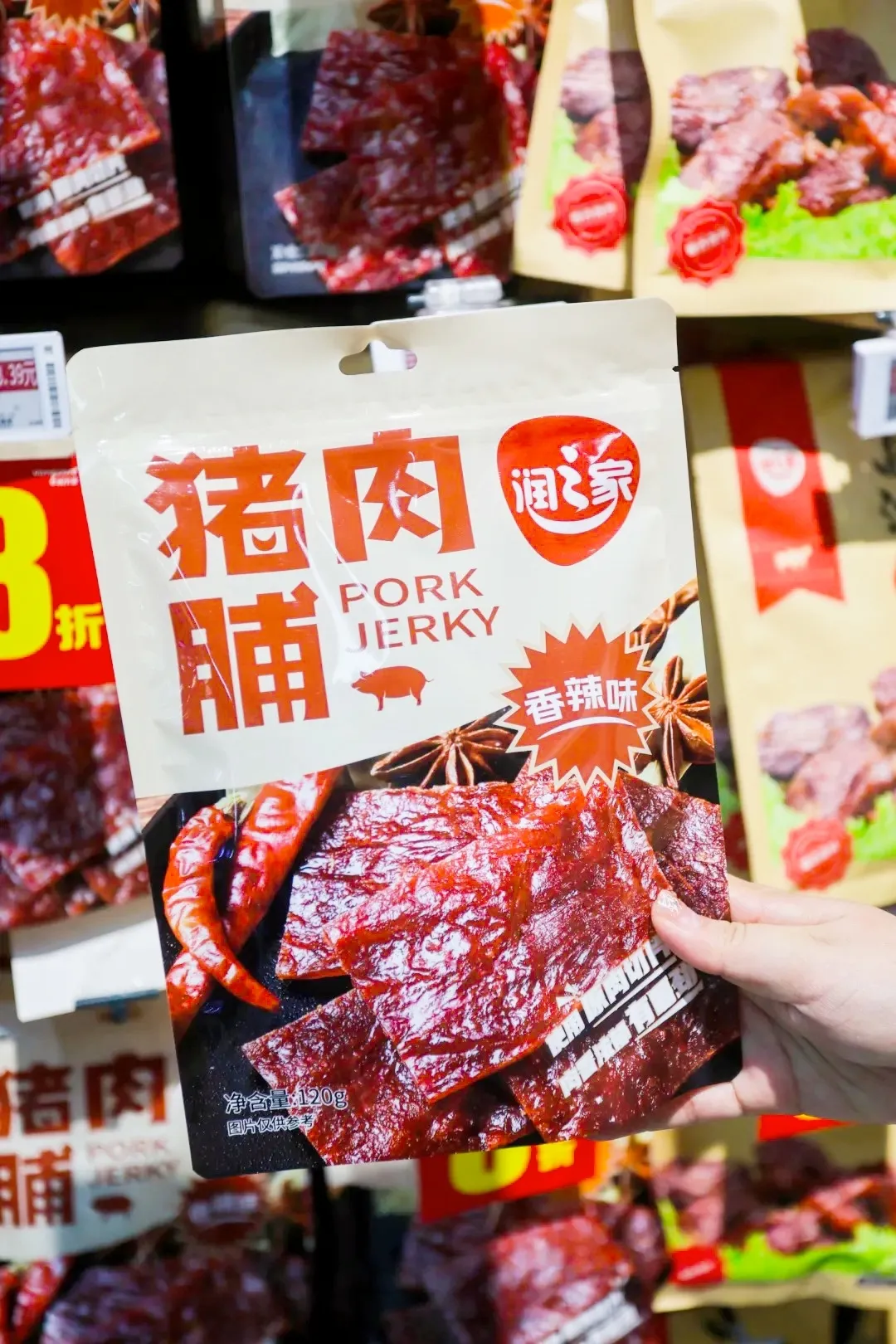 爱吃辣的别错过!据说是靖江传统肉脯制作工艺,猪后腿肉原肉切片、去筋膜去油脂,8小时低温慢烘,猪肉脯厚度扎实,肉质紧实不松散,香辣味是慢慢上来的那种,不会呛喉,后调带着点甜,越嚼越够味。