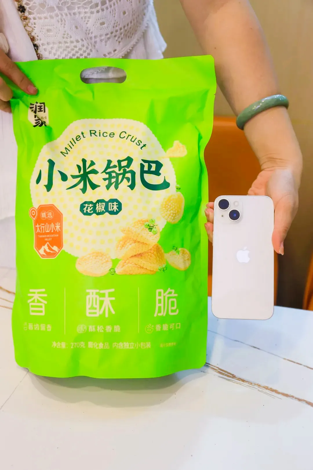 花椒脑袋狂喜,超级大包,这大小和手机对比它简直就PLUS+++。锅巴是立体颗粒状斗笠造型,看起来有趣,吃起来好吃。优选太行山脉优质小米,物理挤压工艺,离心脱油技术不油腻,咬起来“咔嚓咔嚓”停不下来。
