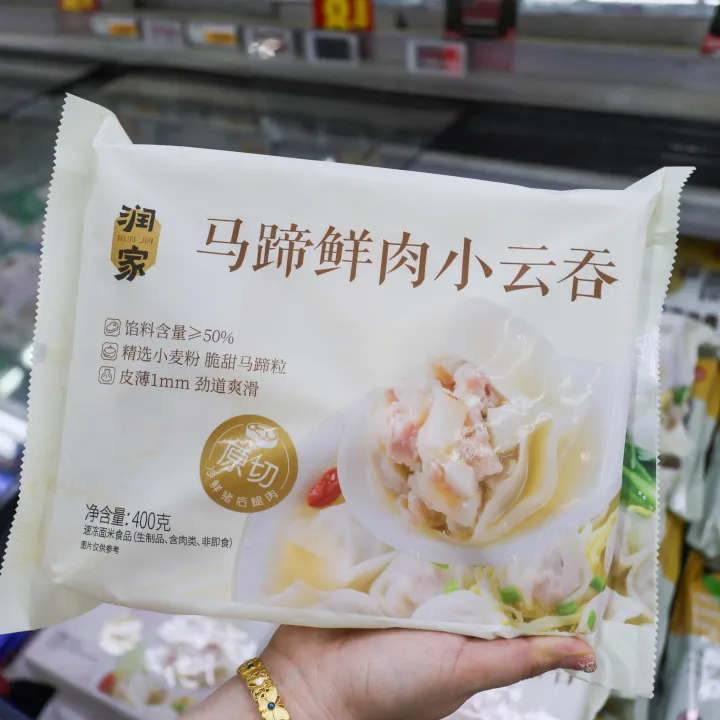 夜宵快手王就是它!馄饨皮超薄实测不超1mm,下锅煮3分钟就熟透飘起来了。选用原切冷鲜猪后腿肉,馅料含量≥50%,咬开后马蹄的脆爽和鲜肉的鲜嫩在嘴里爆开,汤汁鲜掉眉毛。