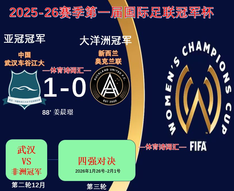 2026年第一届国际足联女足冠军杯(小世俱杯)第一轮比赛今天下午在江城武汉正式打响,在今年五月过五关斩六将,一路跌跌撞撞的武汉车谷江大女足最终拿到亚洲冠军,获得了在世界舞台展现自我价值的资格。在冠军杯上第一轮遇到了大洋洲冠军,来自新西兰的奥克兰联女足。