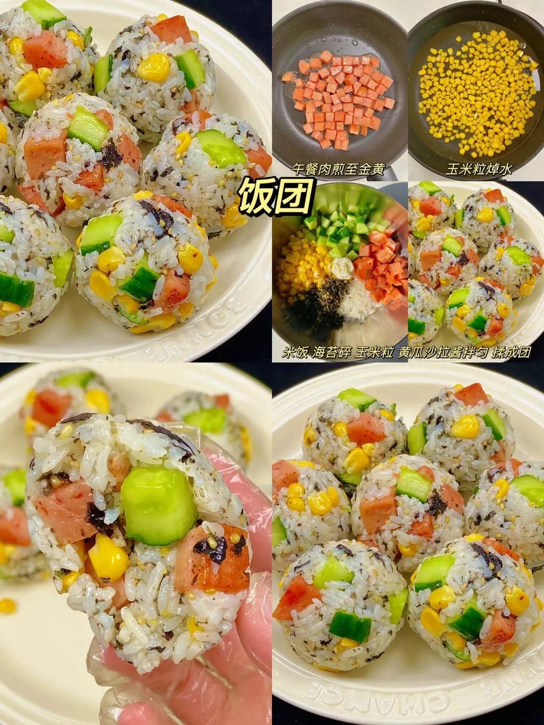 米饭加入海苔碎、玉米粒、黄瓜和沙拉酱拌匀,揉成团即可。