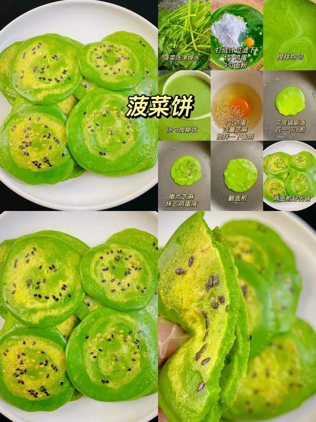 材料:菠菜、鸡蛋、面粉、芝麻、盐。