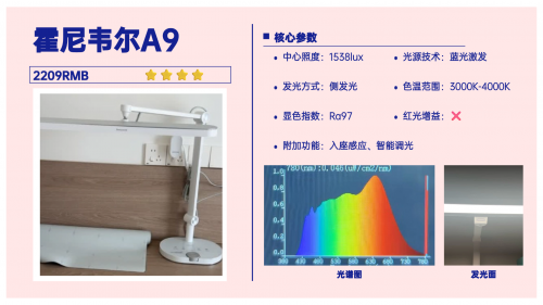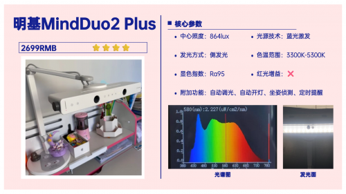 再来看看它的光源配置,采用的是隐藏式光源,创造出来的18°的遮光角可以将光源藏起来,能在一定程度上避免孩子直视。不过它的蓝光峰值偏高,接近1.0了,在千元台灯中表现并不算好。