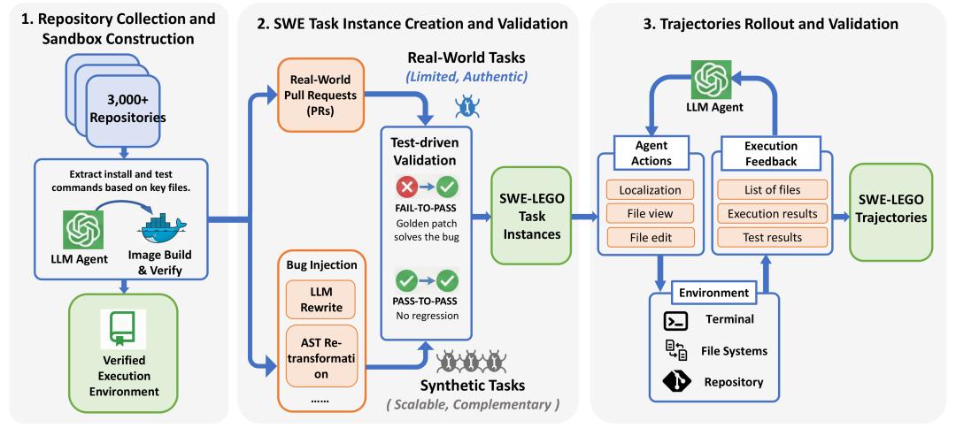 图 3:SWE-Lego 数据管道,结合真实 PR 和合成的软工任务实例,基于专家模型去生成可执行的轨迹用于 SFT 训练