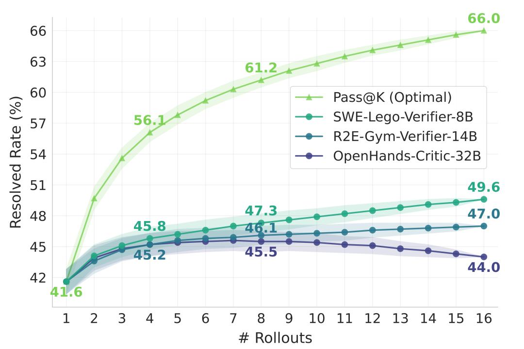 SWE-Lego-Verifier-8B 在 TTS@16 上达到 49.6%,超越了 OpenHands-Critic-32B(44.0%)和 R2E-Gym-Verifier-14B(47.0%)。除了绝对性能外,还观察到不同打分器范式的定性不同缩放行为。OpenHands-Critic-32B 采用回归式范式,在更高的 K 值下表现出性能下降,这是一个反直觉的结果,表明更大的候选池压倒了其判别能力。相比之下,生成式打分器(SWE-Lego 和 R2E-Gym)保持单调改进,趋向于 Pass@K 上限,进一步确认生成式表述提供了更稳健的缩放属性。