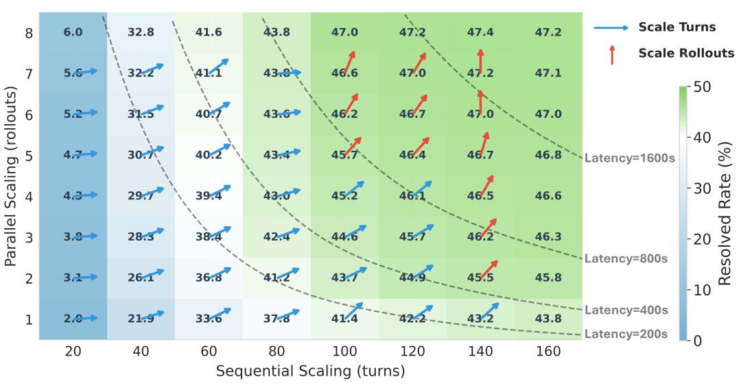 维度 1:串行扩展 vs 并行扩展SWE-Lego 研究了串行扩展和并行扩展之间的资源分配。串行扩展通过增加最大交互轮次实现,在低测试预算的区域非常高效。额外轮次都能获得环境反馈,使模型能够纠正错误并迭代改进解决方案。这使得串行扩展在预算有限时成为首选策略。然而,模型性能在约 100-140 轮后开始饱和,此时相比于串行扩展,更加需要并行扩展来提升性能。