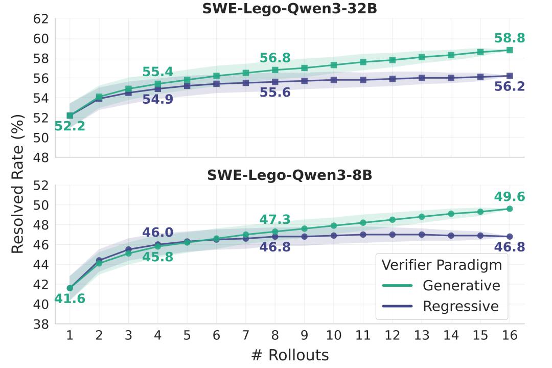 维度 2:生成式 vs 回归式打分器打分器用于从多个候选轨迹中选择最佳方案。SWE-Lego 比较了两种范式:回归式打分器和生成式打分器。