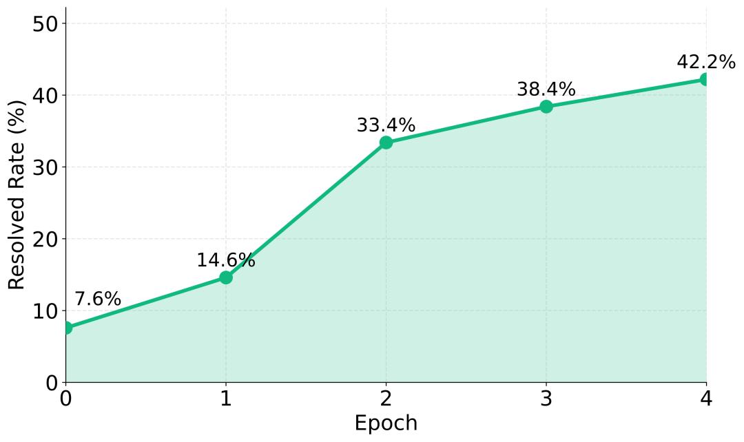 双数据管道互补:GitHub 真实 PR 数据 + 注入真实场景 Bug 的合成数据,产出 32k 高质量任务实例 + 18k 专家轨迹; 严格轨迹筛选:过滤 Git 历史泄露、工具错误等噪声,重用部分解决的优质轨迹,提升 SFT 训练有效性。2. 改进的监督微调:
