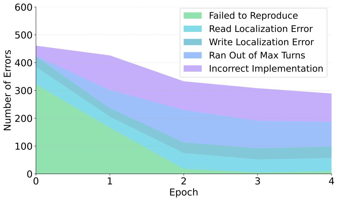 错误类型的变化:训练初期时 "无法复现" 错误占主导,表明模型此时缺乏对软工任务基本的理解能力;训练中期时 "无法复现" 比例大幅减少,但 "定位错误" 比例仍有较多,表明缺乏战略规划;训练后期 "错误实现" 成为瓶颈,表明从过程失败转向推理失败。
