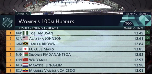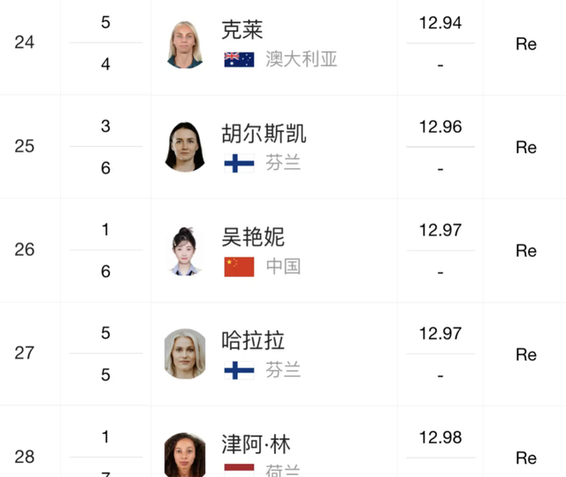 最终,吴艳妮以12.97秒的成绩完成了预赛(第六名),比第一名慢了0.48秒...