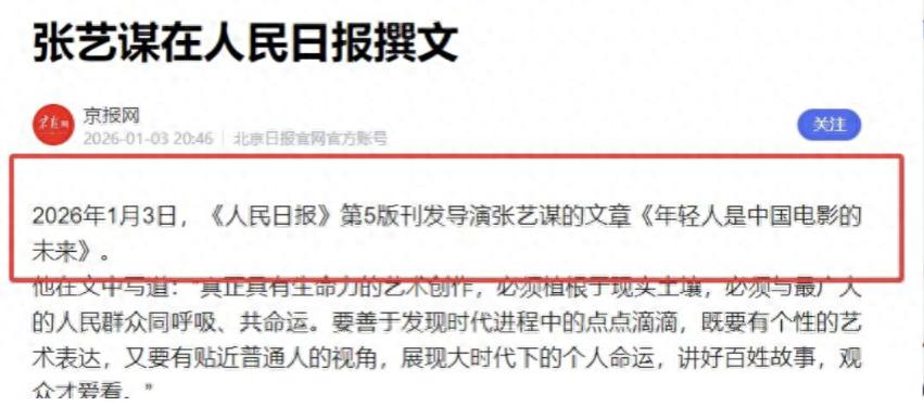 张艺谋在《人民日报》上发表的文章,标题十分直接,为《年轻人是中国电影的未来》。