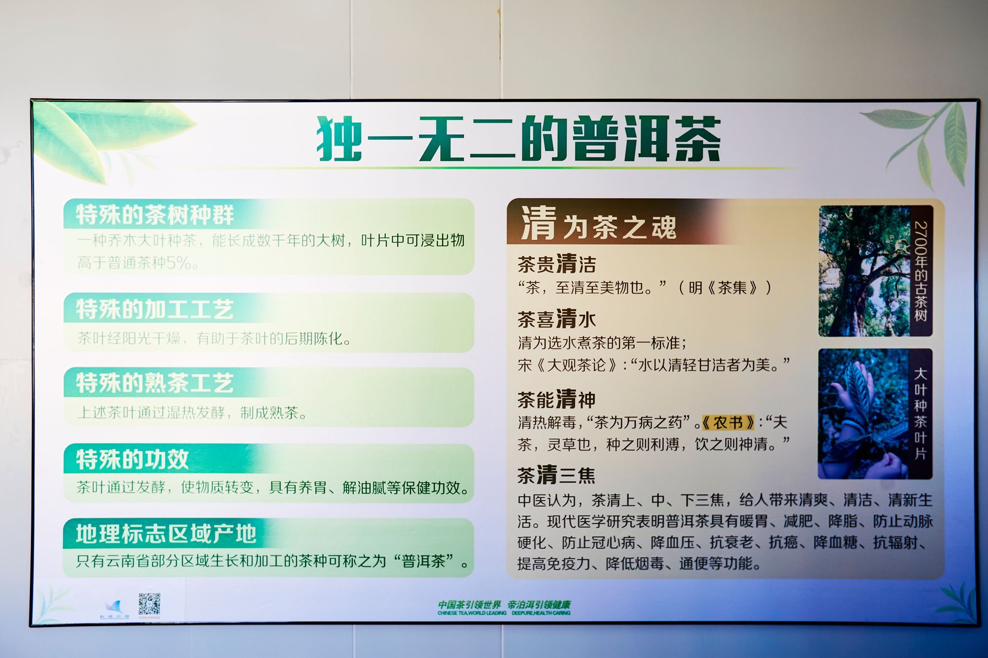 图文展板介绍了关于普洱茶的许多硬核知识——普洱茶被称作茶界“活化石”,历史悠久,最早发源于唐代南诏时期,曾是朝廷贡品。普洱茶主要分为生茶和熟茶,生茶霸气回甘,熟茶温和醇厚,年份越老则越珍贵。