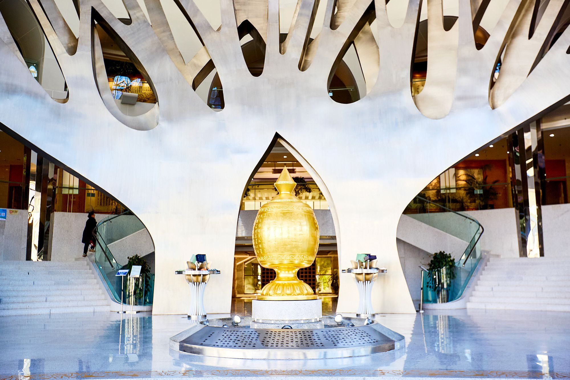 白色镂空造型仿佛两棵参天大树,大树下巨型茶樽雕塑散发着金色光芒,室内展馆不仅是带娃涨知识的好去处,上镜也极有氛围感。