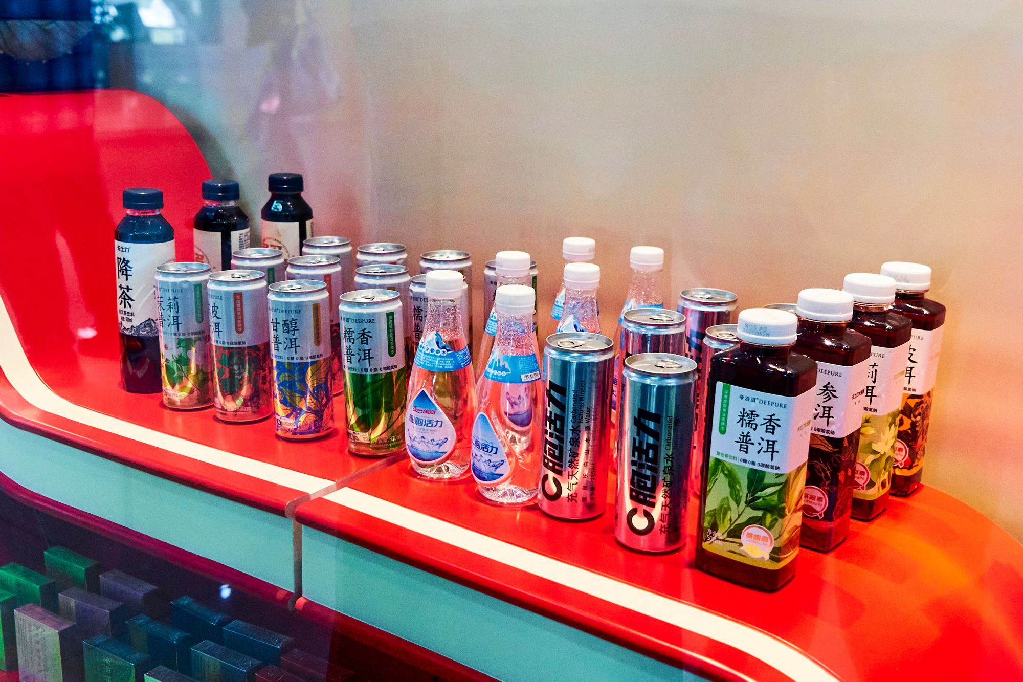 包装精美的帝泊洱茶饮料整齐摆放在展柜上,有糯香普洱、甘醇普洱、参洱、菊洱等不同口味和功能,可以满足不同消费者需求,感兴趣的话还可以现场品尝。