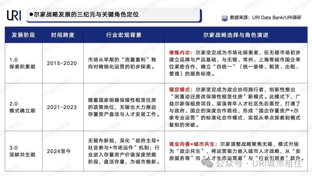 来到3.0 深耕共生期(2024 年至今),无锡深化“政府主导+社会参与+市场运作”机制,行业进入存量资产价值深度挖掘、服务城市焕新的新阶段。尔家进一步调整战略聚焦无锡,将模式升级为“政企共生”,主动将自身运营能力嵌入城市人才战略,完成了从“安居服务商”向“人才生态运营者”与“行业引领者”的角色跃升,真正践行 “商业向善+城市共生” 的发展理念。