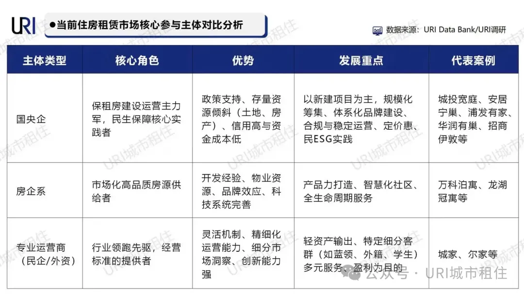 当前国内住房租赁市场已形成多元主体共生的格局,不同类型的参与者凭借自身资源禀赋与能力特征,在行业中扮演着差异化的核心角色:国央企作为保租房建设运营的主力军与民生保障的核心实践者,依托政策支持、资源倾斜与低成本资金优势,以新建项目为核心推进规模化布局,同步深化合规运营与民生 ESG 实践;房企系则凭借成熟的开发经验、物业资源与品牌效应,聚焦高品质房源供给,着力打造产品力与智慧化社区,提供全生命周期服务;而以民企、外资为主的专业运营商,凭借灵活的机制、精细化的运营能力与敏锐的市场洞察力,以轻资产输出为核心方向,为蓝领、外籍人士、学生等细分客群提供多元服务,以盈利为核心目标持续推动行业创新。三类主体各有侧重、互为补充,共同构成了住房租赁市场的生态基底。