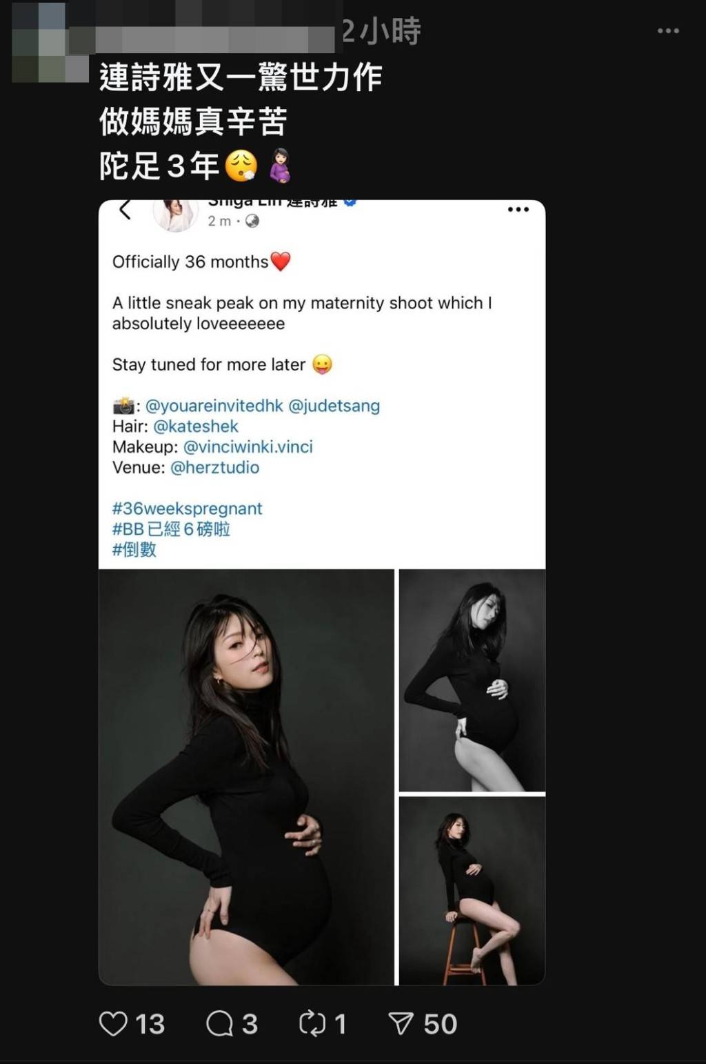 连诗雅目前怀孕已进入尾声,预计本月18日迎接她与陈家乐的小公主Camila的诞生。陈家乐将于17日结束在马来西亚的工作,赶回香港陪伴妻子生产,希望宝宝能按计划出生,不提前「抢闸」。近日,连诗雅在社交平台上分享了一张怀孕36周的照片,并附上一段英文留言。不过细看之下,却发现将「36 weeks」误写为「36 months」,引来网民纷纷留言戏称她是「连十娘」,肚子里怀的是哪吒。被网友发现后,连诗雅更正了这一错误。