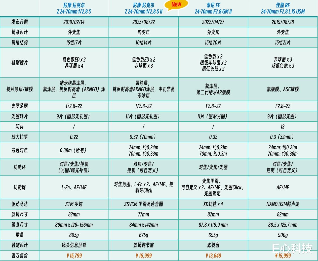 当然,外变焦镜头在收纳时因镜身更短有些优势。不过哪位用24-70mm f/2.8镜头的影友没个大背包啊?为了更好理解这支镜头,我们先看看几家原厂24-70mm镜头的规格。