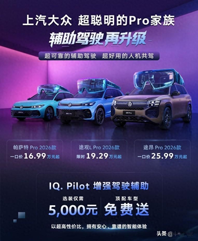 2025年9月29日,上汽大众正式宣布超聪明的油车家族——Pro家族2026款上市,推动燃油车智能化体验迈入2.0阶段,“懂路也懂你,共驾更安心”。2024年起,途观L Pro、帕萨特 Pro、途昂 Pro相继上市,Pro家族为市场带来了“油电同智”的宣言,更凭借过硬的智能化实力,破除了市场与消费者对于油车不智能的偏见。此次升级,Pro家族2026款为用户带来超可靠的辅助驾驶、超好用的人机共驾与越用越懂你的智能座舱,打破燃油车在智能体验上的“代际落差”,真正实现油电同智、体验无界的全新出行时代。