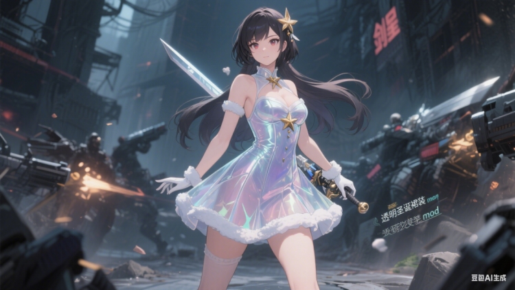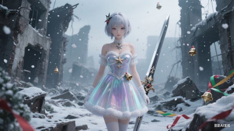 背景选择 “废弃游乐园” 废墟 —— 残破的旋转木马、生锈的摩天轮与散落的圣诞装饰形成强烈对比。让角色背对镜头站立,双脚分开与肩同宽,右手握住武器(如伊芙的 “冰晶剑”),左手自然下垂,裙摆被风吹起,露出内侧的小鹿内衬。调整镜头为 “远景”,将废墟全貌与角色结合,降低 “饱和度” 至 - 0.3,突出 “末日与节日” 的反差感,诠释 “即使在废墟中,也不放弃对节日的期待” 的主题。