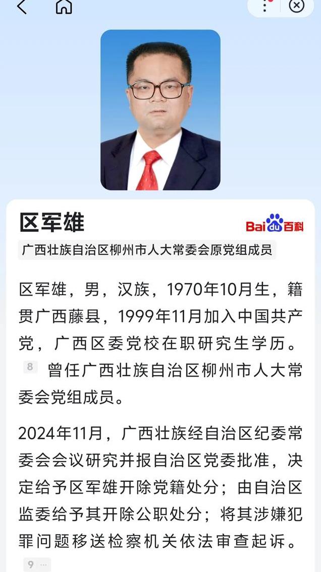 又一位副厅级别的领导干部落马被双开。最新消息,11月30日,广西纪委通报,柳州市人大常委会原党组成员区军雄严重违纪违法问题,其被双开了,双开就是开除党籍和公职。军雄起官职达到了副厅级别,可谓是位高权重的领导,其作为领导万万没有想到贪污腐败,简直是愧对党和国家人民群众的期望,而且现在柳州的轻轨事件闹得沸沸扬扬的,柳州市的两任市委书记相继落马,“政绩工程”就是纸上谈兵,而军雄曾经担任过柳州副市长,其被查可谓是给柳州抹黑了。