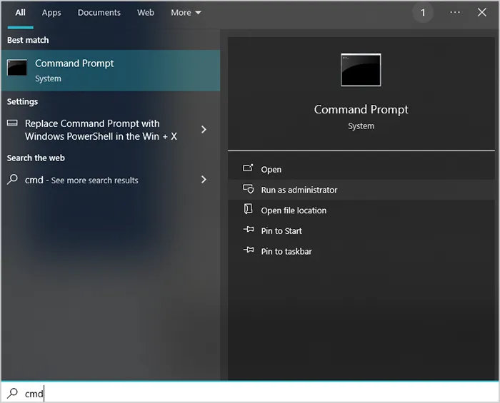 要通过 Diskpart 将 USB 驱动器格式化为 FAT32:插入你的U盘。然后以管理员身份打开命令提示符。你可以在“开始”菜单中输入“ cmd ”,右键单击“命令提示符”,然后选择“以管理员身份运行”。