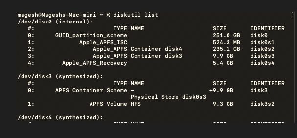 输入“ diskutil list ”并按“ Enter ”键查看所有磁盘的列表。通过名称和大小识别你的U盘。它很可能类似于“ /dev/disk2 ”或“ /dev/disk3 ”。
