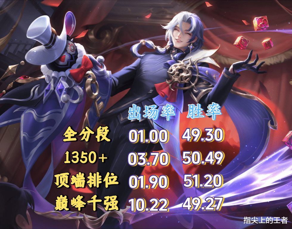 PS:数据取自全区巅峰战力前百,不包括隐藏数据的玩家,另外,双分路的英雄可能出场率会更高,因为会计算到一起,出场率仅统计小国标以上的英雄。