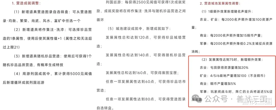1)营造调整:加了很多东西,总结就是“保底”更多了,需要买卖的也更多了,四类加成在75属性时新增1种加成效果,现在更需要每种搞一套,在赛季种不同阶段切换着用,建议策划给营造加个一键切换功能,就像武将装备,营造这部分留在后续《将作府第(3)期》再详说