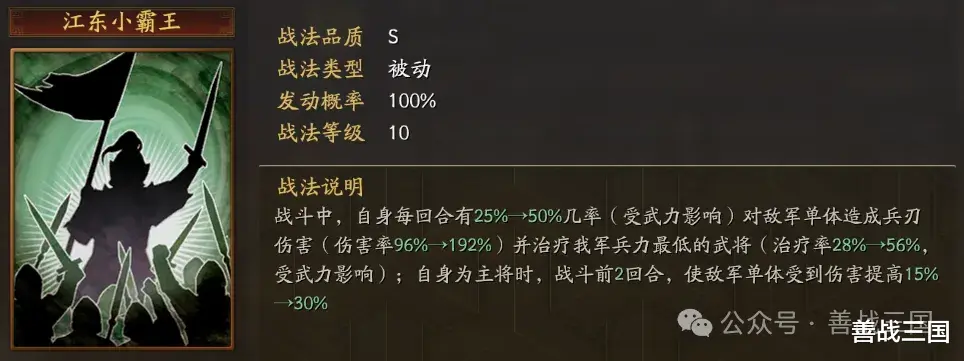 新版“江东小霸王”整个战法机制看着很强,目测作为开荒将不错(除了速度差点),比如左慈乐进孙策,乐进主C,孙策补伤补奶,乐进群体伤害对孙策加的单体30%易伤利用率很高,兵种还能枪骑切换,覆盖全守军