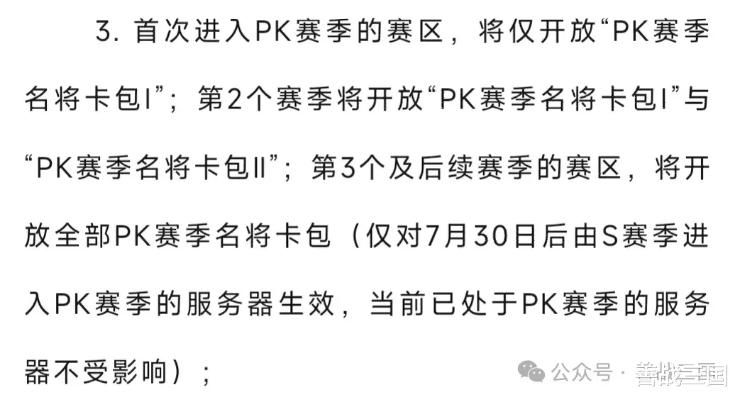 2)龙虎副本可以兑换事件战法,兑换结果不影响正式服数据;3)演武场:已上阵的武将也可进行练兵4)军阵削弱:4级减2级98,5级减3层985)兵贵先声:准备时间调整为8小时(三)卡包调整:7月20号9点55分生效1)SP孙坚进PK赛季名将卡包42)新事件战法“知己知彼”兑换条件:魏蜀吴各任选1名名将3)S1赛季名将卡包新增陆抗、高览、魏延、袁术,魏延和威谋进S赛季有点降维打击的感觉,比如刘备张飞魏延的蜀盾,还有低属性的袁术在S赛季就显不出来短板了,还能带动破阵所向的价值,比如袁术+华佗/蔡姬/祝融锋矢骑;4)S2赛季名将卡包新增以上4名外,再加王元姬、张让、张春华、荀攸:辽姬骑进场S2赛季,还有张让传承的竭力佐谋,压制司马懿,又能搭配魏延竭力+威谋/所向,不敢想象S赛季玩家要经历什么;5)S3赛季名将卡包新增以上8名外,再加王双、沮授、伊籍、蔡邕:王双的破军和沮授,让玩紫朱儁和甘宁的平民多点对S3的期待6)7月30以后从S赛季进入PK赛季的服务器,PK赛季名将卡包(1-4)逐渐开放,保护刚进PK赛季玩家不碰上PK赛季最新的武将,也意味着以后PK赛季新武将都会优先进PK3-4,再慢慢往PK1-2下放