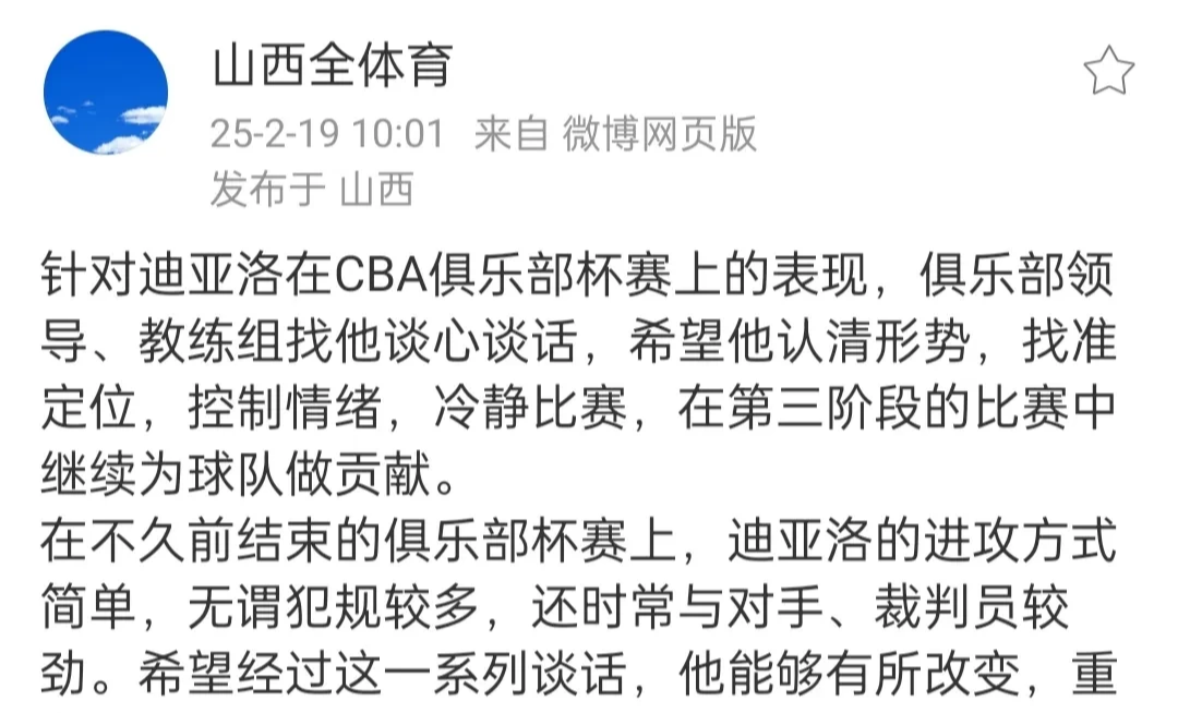 山西男篮管理层找迪亚洛谈话,告诉他要控制情绪!截止目前,迪亚洛本赛场均上场25.3分钟,可以得到22.1分7.2篮板3.0助攻1.9抢断,投篮命中率50%,三分命中率31%,罚球命中率72%。古德温不稳定,大外援没有进攻能力,在山西男篮现有外援的情况下,球队要想保住前4位置,迪亚洛第三阶段需要承担更多,攻防两端都需要更加稳定强势的表现。能力毋庸置疑,避免情绪化,用合理自己擅长的方式打球,去带领球队赢得比赛是重中之重。