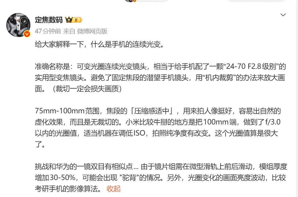 根据博主定焦数码所说:「手机的连续光变,准确名称是:可变光圈连续光变镜头,相当于给手机配了一颗“24-70 F2.8级别”的实用型变焦镜头。避免了固定焦段的潜望手机镜头,用“机内裁剪”的办法来放大画面。(裁切一定会损失画质)75mm-100mm范围,焦段的「压缩感适中」,用来拍人像挺好,容易出自然的虚化效果,而且是无裁切的。小米比较牛掰的地方是把100mm端,做到了f/3.0以内的光圈值,适当机器在调低ISO,拍照纯净度有改变。」