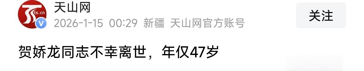 2026年1月14日晚上23时12分,贺娇龙去世的消息让许多人流泪痛哭,她是万千网友心中的好干部,为新疆的旅游业和农业做出了数不清的贡献,是为了新疆人民生活的更好而付出一切的人。