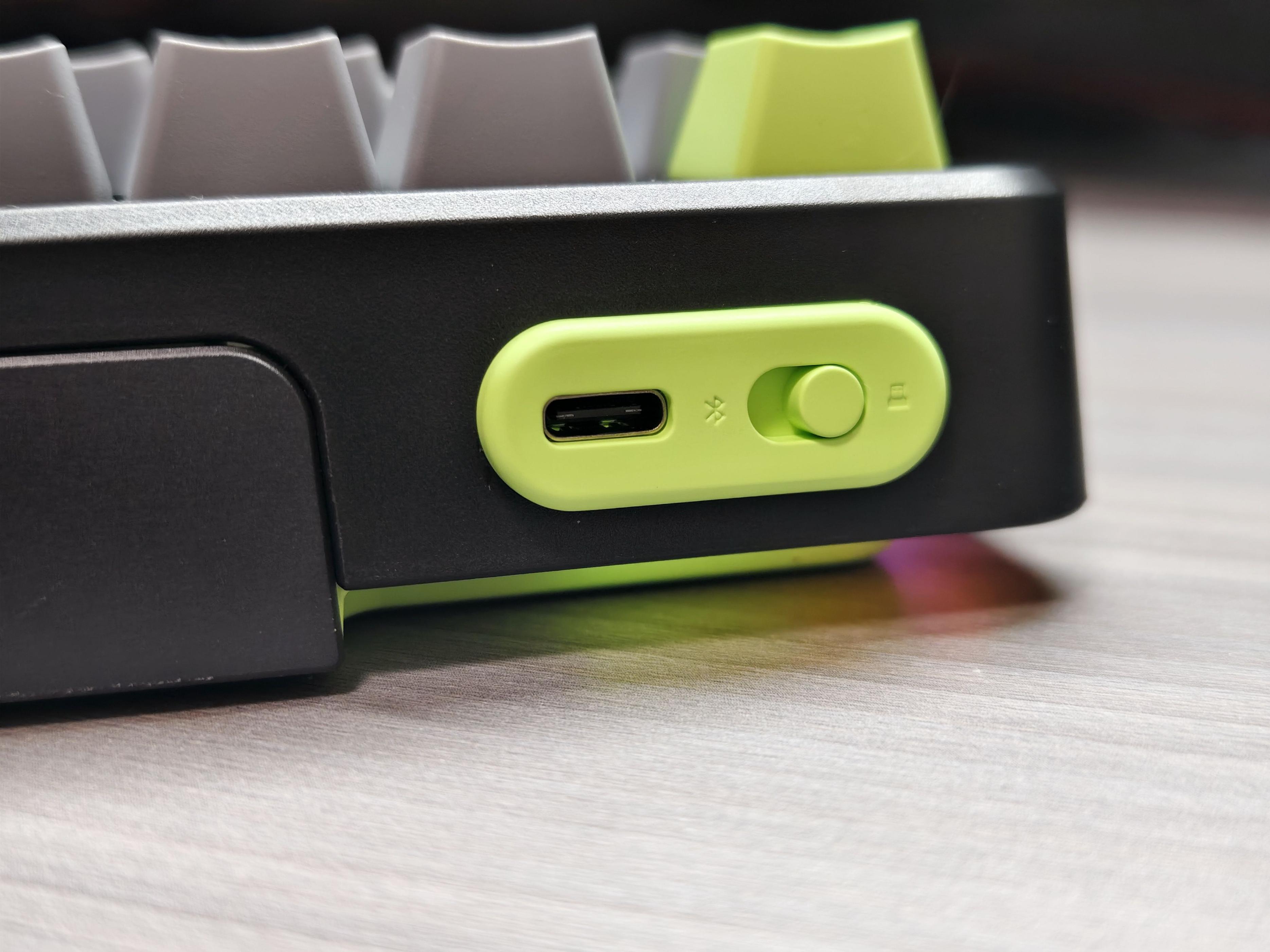 Type-C接口在左边,三模切换开关就在旁边,往左2.4G无线、中间有线、往右蓝牙5.0,拨一下就能换设备,简单粗暴。我喜欢用2.4g模式,基本也感受不到延迟~