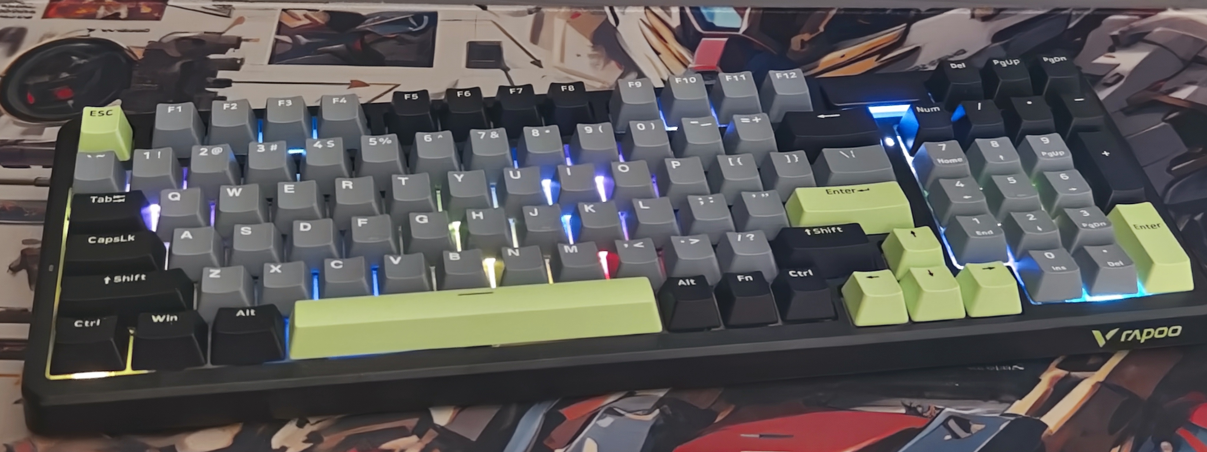 用了几年的旧键盘用着是真遭罪,手感硬得跟块铁板似的,打字跟砸键盘一样难受;连接还老抽风,关键时刻不是卡就是断,写方案打到一半或者游戏团战正激烈,突然失灵能让人原地爆炸。实在忍不了就决定换键盘,挑来挑去看中功能全的,雷柏新出的V700DIY-98这个多模无线+能自己改的设定太戳我了,选的初号骑士配色又帅又实用。用了一段时间,谈谈使用体验~