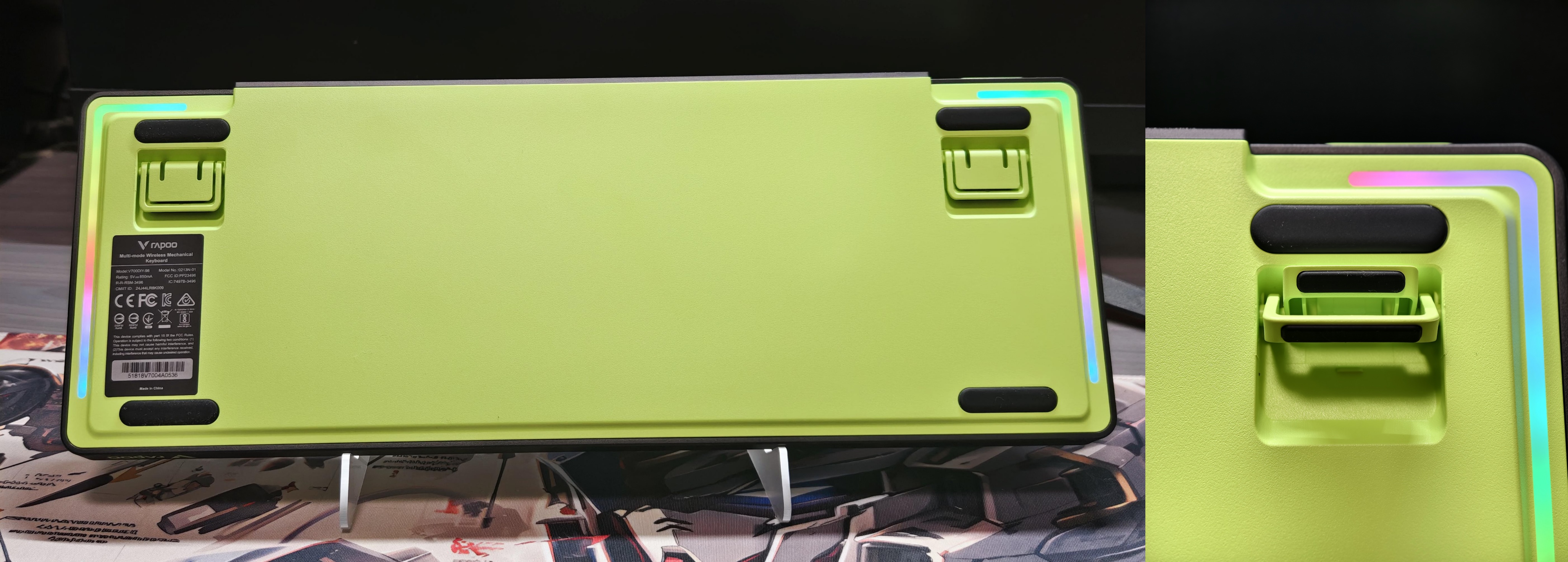 背面四个硅胶脚垫,二段式脚撑,我日常用一段的高度就足够了~还有炫酷的rgb灯带~