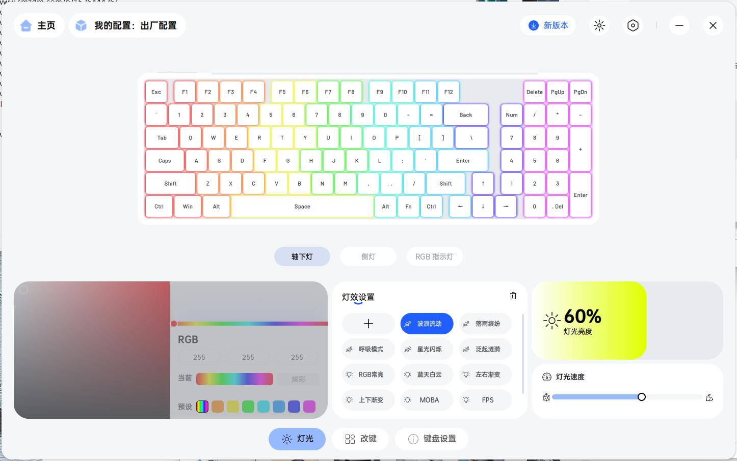 灯光系统也够炫,1680万色RGB+20种轴下灯效,波浪流动落雨缤纷啥的特别带感。