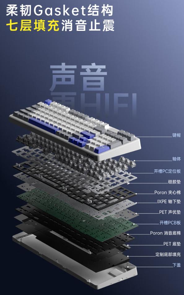 雷柏 V700DIY-98 直接将自家机械键盘的档次大幅提升,其在结构设计上颇具亮点。它采用了热门的 Gasket 结构,搭配 PCB 单键开槽设计,并配备 7 层消音填充,从内到外都彰显出精心打造的诚意~