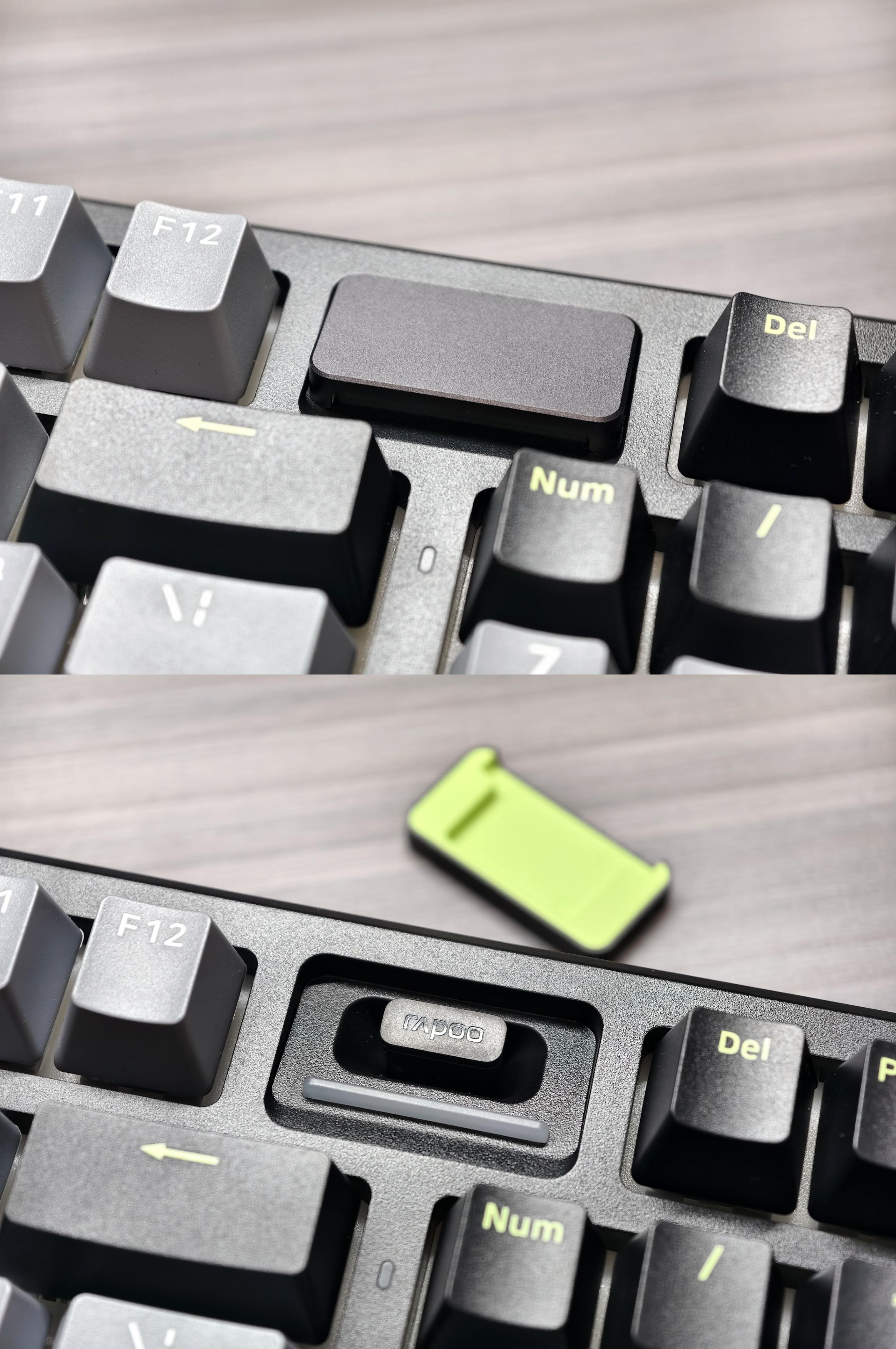 98键布局特别紧凑,右上角无线接收器收纳仓设计有点意思——官方管他叫时空幻境仓,省空间的同时还方便带着走。不过因为这个收纳仓,DEL键被挤到右边去了,用惯传统布局的需要适应下。